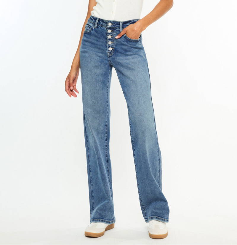 Bring back the 90s in style. These high-rise flare jeans hug your waist, stretch for comfort, and feature a clean, non-distressed look with a trendy exposed button fly. Medium wash perfection.